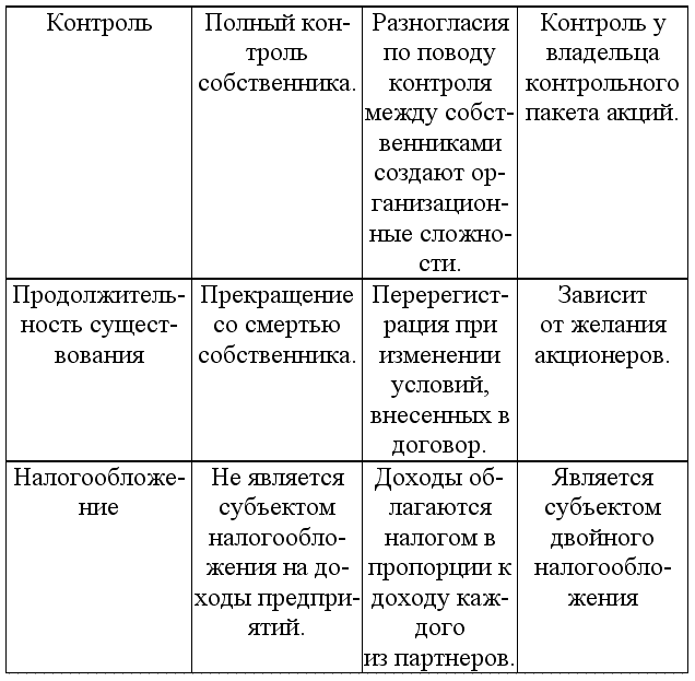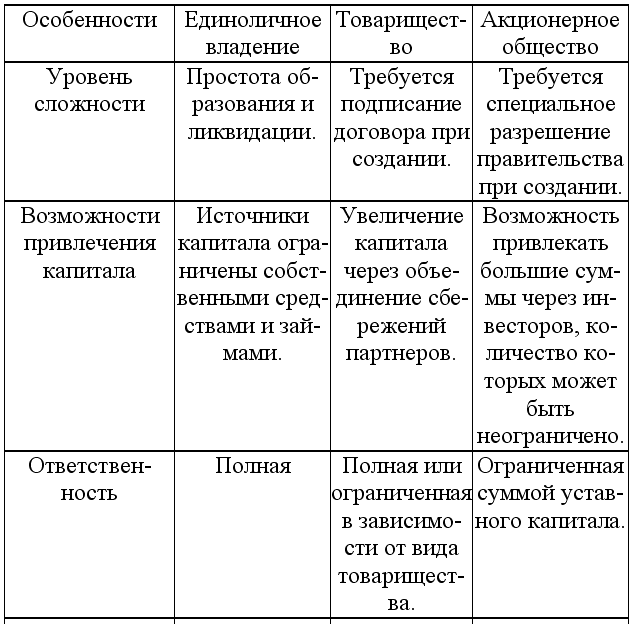 Особенности индивидуального предприятия, товарищества (партнерства) и акционерного общества (корпорации) как основных организационно-правовых форм предпринимательской деятельности можно рассматривать как достоинства и недостатки по отношению друг к другу. В таблице 7 представлены достоинства и недостатки этих форм с точки зрения сложности образования, способности привлекать новые капиталы, ответственности, контроля, продолжительности существования и налогообложения.