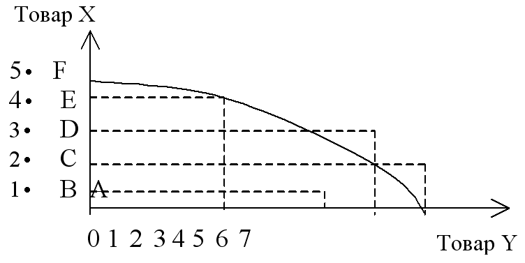 На графике изображена кривая производственных возможностей, каждая точка которой показывает количество товара X, производимого при полном использовании всех имеющихся ресурсов, взамен товара Y. Точки А, Е, F представляют производственные возможности общества в производстве товаров X и Y. Если производится два товара X, то семь товаров Y. Точка B показывает, что производство организованно неэффективно и есть неиспользованные ресурсы, например, рабочая сила. Точки C и D показывают уровень производства, недостижимый при данной технологии. Такая «сверхэффективность» в условиях ограниченных ресурсов возможна лишь при усовершенствовании технологии.