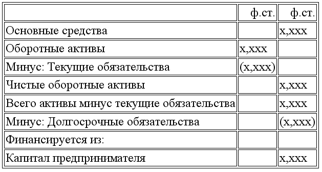 (б) Вертикальный формат. В настоящее время это – наиболее распространенная форма балансового отчета. Этот формат может иметь не одну модификацию, например, для единоличного предпринимателя наиболее типичной является приведенная ниже форма: