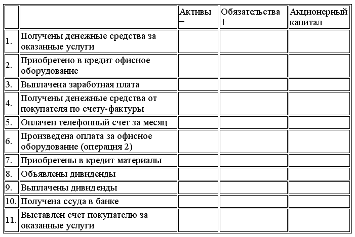 32. Проведите анализ нижеприведенных операций, совершенных акционерным обществом, и заполните таблицу, используя знак «+» для указания увеличения и знак «-» для указания уменьшения компонентов основного балансового уравнения.
