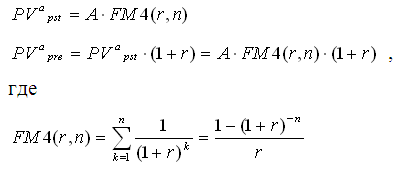 Для оценки будущей и приведенной стоимости аннуитета можно пользоваться формулами (3.4) и (3.6), вместе с тем благодаря специфике аннуитетов в отношении равенства денежных поступлений эти формулы могут быть существенно упрощены. В частности, для решения прямой задачи оценки срочных аннуитетов постнумерандо и пренумерандо при заданных величинах регулярного поступления (A) и процентной ставке (r) можно воспользоваться формулами: