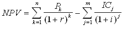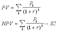 Допустим, делается прогноз, что инвестиция (IC) будет генерировать в течение n лет, годовые доходы в размере P1, P2,…, Рn. Общая накопленная величина дисконтированных доходов (PV) и чистый приведенный эффект (NPV) соответственно рассчитываются по формулам: