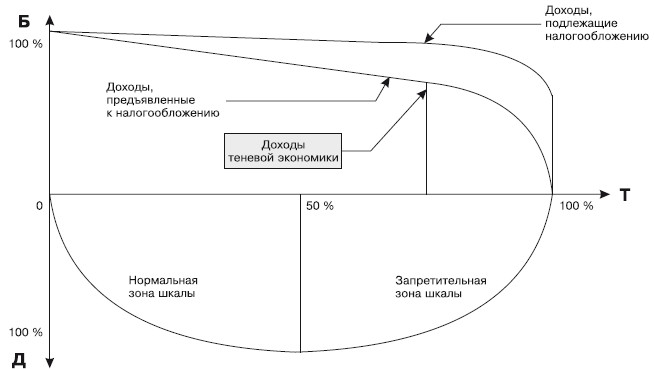 Рис. 1.1. Кривая Лаффера: Д – доходы; Б – налоговая база; заинтересованность в легальном заработке; Т – ставка налога, %
