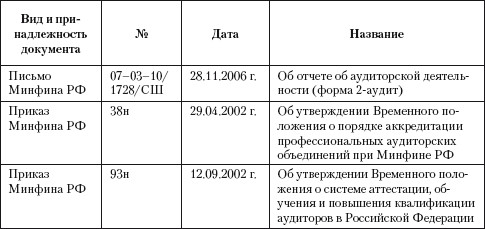 Таблица 2.2. Документы министерств и ведомств, регулирующие аудиторскую деятельность в Российской Федерации