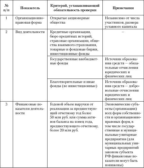 Бухгалтерская отчетность экономических субъектов подлежит ежегодной аудиторской проверке, если любой из перечисленных Федеральным законом № 307-ФЗ показателей деятельности экономических субъектов соответствует установленному критерию. Перечень показателей и установленных критериев приведен в табл. 2.6.