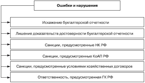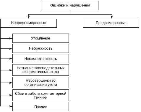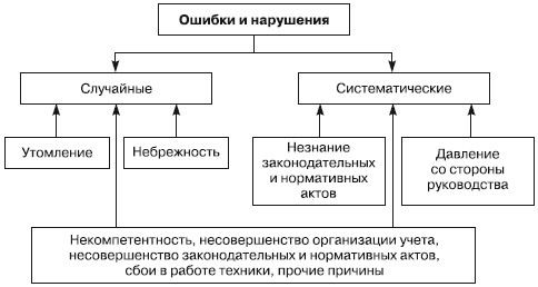 Поскольку в конечном итоге задачей аудитора является установление фактов наличия или отсутствия в бухгалтерской отчетности существенных ошибок (искажений), а также фактов наличия или отсутствия существенных нарушений установленного порядка ведения бухгалтерского учета, то для практического аудита весьма важными являются такие вопросы, как виды возможных ошибок и нарушений, причины их возникновения, возможные последствия. От ответов на эти вопросы будет зависеть выбор вида, объема, способа осуществления аудиторских процедур, формирование программы аудиторской проверки.