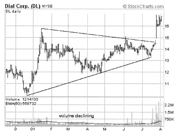 Рассмотрим прорыв вверх (breakouts upside) цены акций компании Dial Corporation в середине 2001 года. На протяжении нескольких месяцев этот производитель мыла игнорировался как краткосрочными трейдерами, так и инвесторами, поскольку фундаментальные перспективы предполагались полностью нейтральными. Рост акций компании был скромным, но стабильным. Тем не менее, не было никаких особых причин бросаться торговать ее акциями (см. рисунок 1-9).