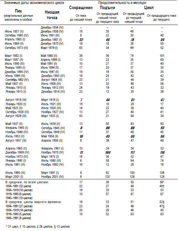Ни один экономический цикл не похож на другой. Как показано в таблице, за то относительно недолгое время, пока люди измеряли параметры экономики США, периоды подъемов (от низшей точки падения производства до высшей точки подъема) и спадов (от высшей точки до низшей) сильно варьировали по продолжительности, хотя предшествовавшие циклы, особенно в недавнее время, были обычно длиннее и устойчивее, чем последующие. Подъемы продолжались от 120 месяцев (апрель 1991 – апрель 2001) до 10 месяцев (март 1919 – январь 1920), а спады – от 43 месяцев (сентябрь 1929 – март 1933) до 6 (февраль 1980 – июль 1980). Амплитуда высших и низших точек также значительно менялась от цикла к циклу.