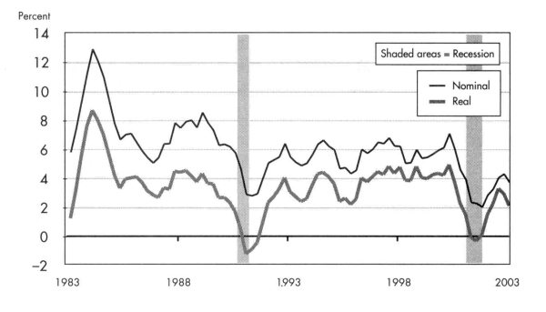 Рис. 1.2. Годовые процентные изменения в реальном и номинальном ВВП (затененные участки – спады)