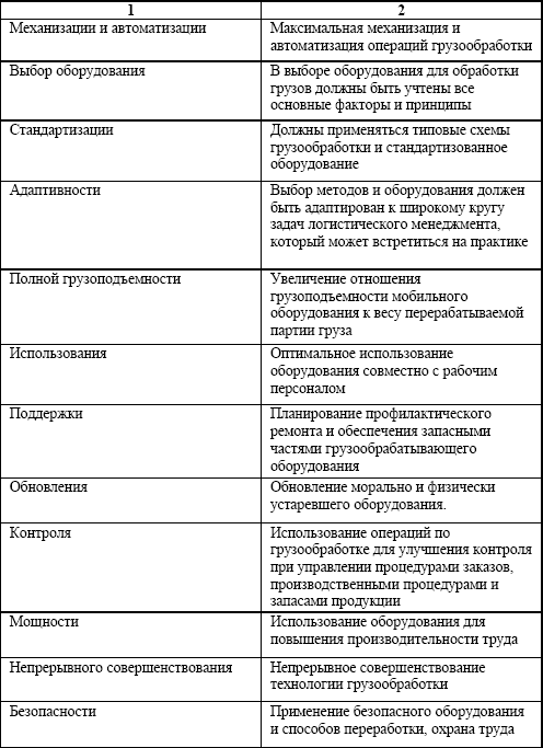 Основные логистические принципы современной грузообработки приведены в таблице. Они должны быть реализованы при управлении грузообработкой в логистических системах для повышения эффективности использования складской площади и высоты.