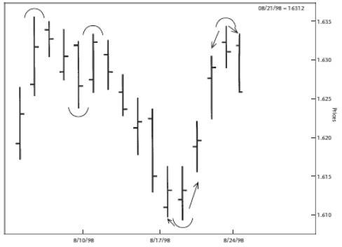 Как только у вас появится основополагающее понимание структуры рынка, вы сможете начать определять, причем очень рано, рыночные повороты. Вы всегда будете знать, что краткосрочный минимум достигнут, когда увидите более высокий дневной максимум с более низким минимумом, чем в предшествующий день. Характер такого пробивного движения дает нам знать о прекращении краткосрочного колебания. Подобным же образом, при опускании цены ниже минимального значения предыдущего дня и при ценовом максимуме, более высоком, по сравнению с предыдущим, происходит формирование краткосрочного пика. Из этого следует, что в продолжение торговой сессии мы можем распознавать формирование этих точек.