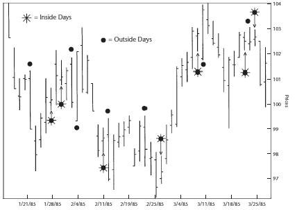 Держа в уме вышесказанное, проанализируйте Рисунок 1.5, служащий иллюстрацией внутренних и внешних дней. Не забывайте, что мы стремимся идентифицировать краткосрочные колебания, при которых трейдеры перемещают цену от одной точки остановки к другой.