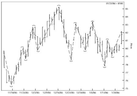 Теперь вы уже должны понимать базовую идею и быть в состоянии видеть, как цена движется, колеблясь. На Рисунке 1.6 я пометил эти точки остановок и соединил их прямыми линиями, дабы более наглядно представить модели колебаний.