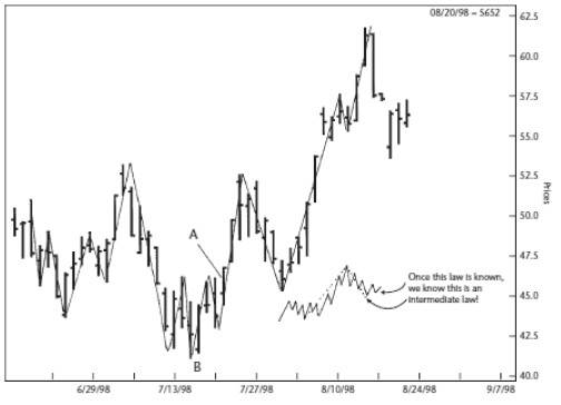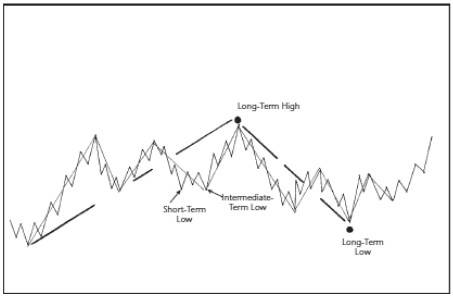 Пора изобразить все это графически. На Рисунке 1.7 я отметил все краткосрочные колебания, затем – среднесрочные точки и, наконец, перешел к следующему уровню и отметил долгосрочные поворотные точки. Этот график говорит сам за себя. Это действительно все, что происходит на рынке, выраженное в простой форме. Если вы взглянете на это теперь, когда вы приобрели некоторые знания, то поймете структуру рынка и увидите, что мы можем в значительной степени упорядочить хаос.