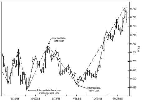 Держа в уме вышесказанное, я перешел от типового графика к реальным графикам фьючерсов на швейцарский франк и кофе (см. Рисунки 1.8 и 1.9). В первую очередь я отметил все краткосрочные колебания, а затем начал наносить, согласно графической модели, максимальные/минимальные краткосрочные точки. Затем я идентифицировал следующую группу максимальных/минимальных среднесрочных точек и, наконец, перешел к долгосрочным точкам. На словах все звучит замечательно, но пока вы не изучите эти графики, вам будет трудно представить правильную картину. Поупражняйтесь.