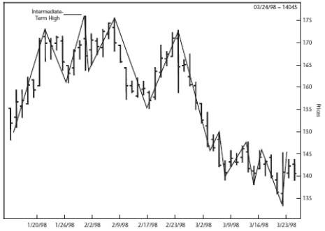 А теперь самое интересное! Смотрите: если мы можем выделить краткосрочный максимум, определив его как день с более низкими максимумами (не учитывая внутренние дни) с обеих сторон, мы можем сделать гигантский шаг вперед и определить среднесрочный максимум (intermediate term high) как какой-либо краткосрочный максимум с более низкими краткосрочными максимумами по обеим сторонам. Но это еще не все, потому что мы можем сделать еще один шаг и сказать, что любой среднесрочный максимум с более низкими среднесрочными максимумами с обеих сторон – вижу, вы уже схватили суть – образует долгосрочный максимум (long-term high).