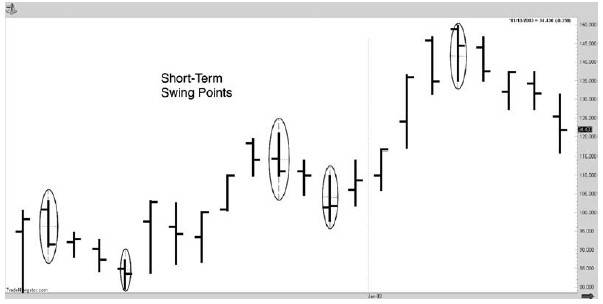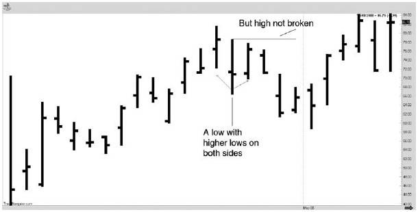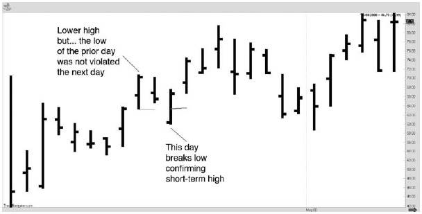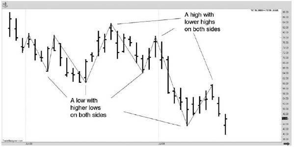 Рынок фиксирует краткосрочный минимум, когда минимум дня (или бара, если вы используете какой-либо иной временной период) оказывается выше с обеих сторон. Подобным образом, краткосрочный максимум фиксируется, когда день (или бар) имеет меньшие бары с обеих сторон.