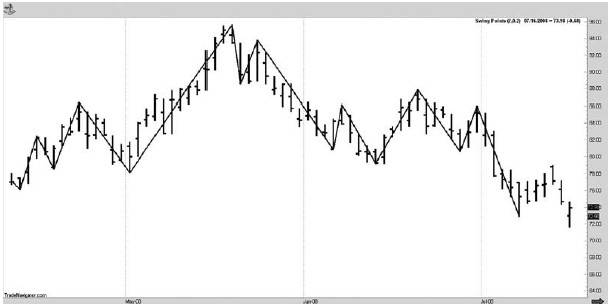 Поскольку рынок склонен колебаться от одной точки к другой, мы можем идентифицировать эти колебания. Это достаточно серьезное заявление, поскольку идентификация означает способность расчета и определения всех рыночных движений на механической основе. Такого рода колебания позволяют, во-первых, определять наличествующую на рынке тенденцию и, во-вторых, момент изменения тенденции. Прелесть рыночной структуры в том, что она четко отображает действия цены.