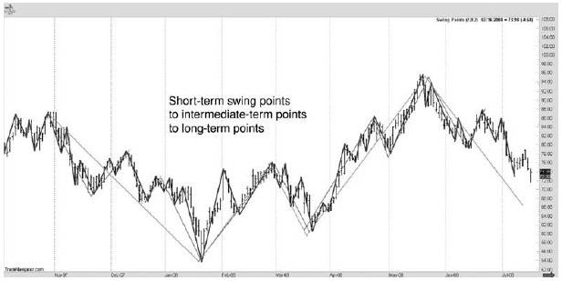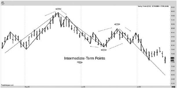 Взгляните на Рисунок 1.17. Мы сумели идентифицировать все краткосрочные колебания на рынке, что дало нам возможность определиться со среднесрочными колебаниями, которые, в свою очередь, помогают распознаванию долгосрочных точек!