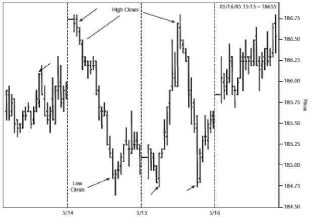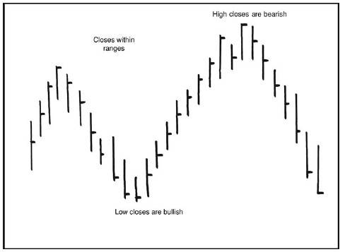 Рынки формируют дно при цене закрытия на уровне минимума дневного диапазона и формируют вершину, когда закрываются на уровне или близко к максимуму дневного диапазона.