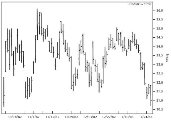 Следующий график (Рисунок 2.21) должен сделать для вас этот урок по спекуляции более живым, дабы вам не пришлось тратить впустую время или деньги в процессе обучения, как это делал я. График на Рисунке 2.21 иллюстрирует, изменение цены фьючерса на кофе в течение реального рыночного дня, а справа на графике показано, каким получился бар за весь день.