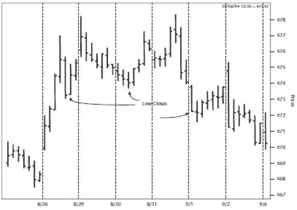 2. Почти все рыночные минимумы наступают сразу или вскоре после того, как рынок закрывается прямо на минимуме дня.