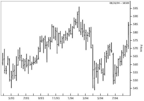 Рисунок 2.26 Ценовой график фьючерса на фондовый индекс S&P 500 (недельные бары).