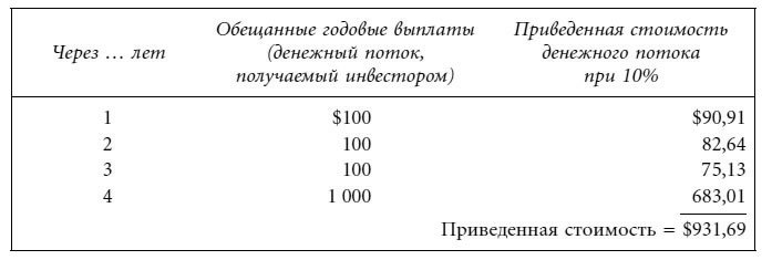 Вычисление доходности сводится к поиску такой процентной ставки, при которой приведенная стоимость денежных потоков окажется равной $903,10 (т. е. цене данного финансового инструмента). Подстановка процентной ставки 10 % дает следующий результат: