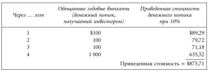 Приведенная стоимость, вычисленная исходя из процентной ставки, равной 10 %, превышает цену ($903,10). Таким образом, для уменьшения приведенной стоимости процентная ставка должна быть увеличена. Предположим, что она составляет 12 %. В этом случае, как видно из таблицы, приведенная стоимость окажется равной $875,71: