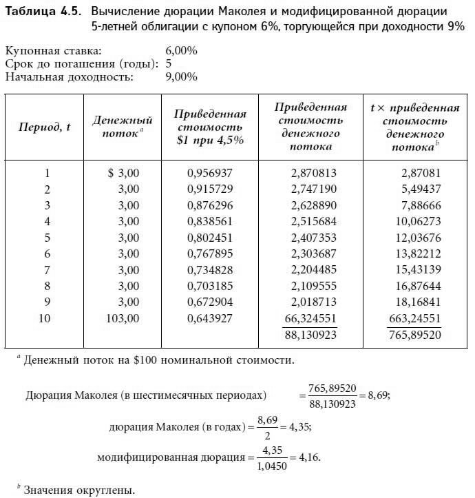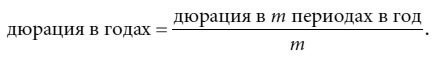 В табл. 4.4 и 4.5 приводятся данные о дюрациях Маколея и модифицированных дюрациях двух пятилетних купонных облигаций. Дюрации выражены в количестве периодов (а не лет). Таким образом, мы имеем дело с полугодовой дюрацией: денежные потоки данных облигаций поступают раз в полгода. Для получения значений годовой дюрации, приведенные значения следует поделить на 2 (см. примечания к табл. 4.4 и 4.5). Заметим, что при поступлении денежного потока m раз в году дюрация, выраженная в годах, уточняется путем деления на m, т. е.: