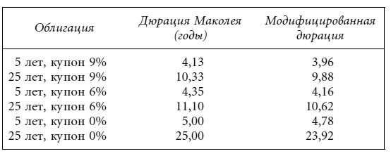 Свойства дюрации. Как видно из анализа значений дюраций шести гипотетических облигаций, модифицированная дюрация и дюрация Маколея купонных облигаций меньше, чем их срок до погашения. Из формулы явствует также, что дюрация Маколея облигации с нулевым купоном равна ее сроку до погашения; модифицированная дюрация облигации с нулевым купоном, однако, меньше ее длительности. Кроме того, чем меньше купон, тем, как правило, больше дюрация Маколея и модифицированная дюрация облигации[21].