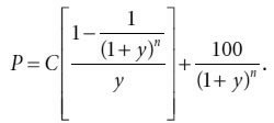 Вместо того чтобы использовать выражение (4.5) для вычисления дюрации Маколея и формулу (4.7) для получения модифицированной дюрации, мы предлагаем разработать альтернативное выражение, не требующее кропотливых вычислений, предполагаемых формулой (4.5). Цену облигации мы выразим в терминах следующих двух компонентов: 1) приведенная стоимость аннуитета, где аннуитет – это сумма купонных выплат; и 2) приведенная стоимость номинала. Таким образом, цена облигации номинальной стоимостью $100 будет равна[20]: