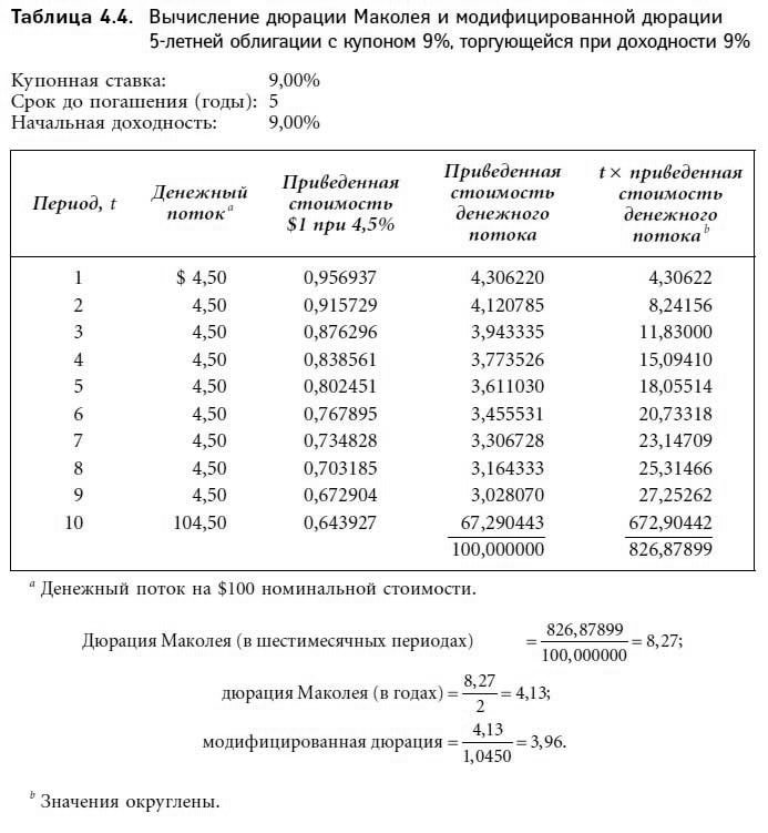 Из табл. 4.2 мы видим, что реальное процентное изменение цены составляет –1,05 %. Если же доходность вдруг упадет с 9 % до 8,90 % (падение на 10 базисных пунктов), то аппроксимированное процентное изменение цены, согласно формуле (4.11), окажется равным +1,06 %. Из табл. 4.2 мы знаем, что реальное процентное изменение цены равно +1,07 %. Мы видим, таким образом, что при малых изменениях требуемой доходности модифицированная дюрация дает хорошую аппроксимацию процентных изменений цены.