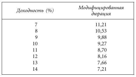 И наконец, еще один отмеченный нами ранее фактор, влияющий на волатильность цены облигации, – доходность к погашению. При прочих равных, чем выше уровень доходности, тем ниже волатильность цены. Так же обстоит дело и с модифицированной дюрацией. Пример тому – собранные в таблице данные о модифицированной дюрации 25-летней облигации с 9 %-ным купоном при различных уровнях доходности: