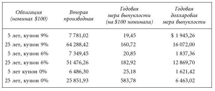 Годовая долларовая мера выпуклости и годовая мера выпуклости для наших шести гипотетических облигаций выглядят следующим образом: