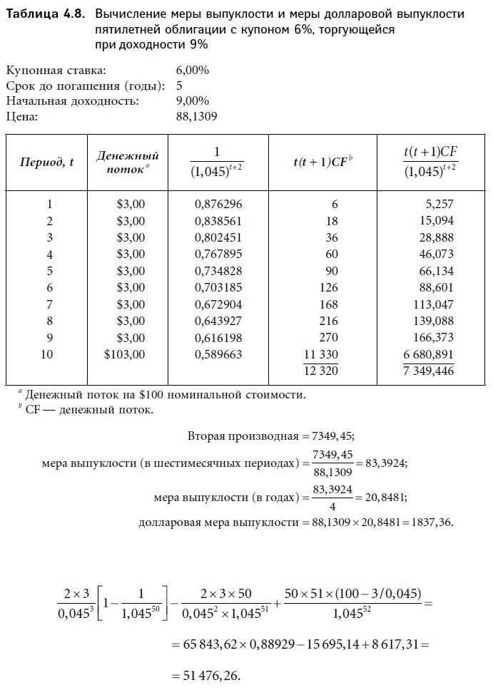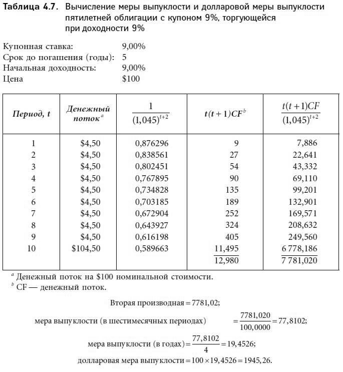 В табл. 4.7 и 4.8 приведены значения второй производной [формула (4.21)], годовой долларовой меры выпуклости и годовой меры выпуклости для двух пятилетних купонных облигаций. Мера выпуклости выражена в квадратах периодов. Для перевода меры выпуклости в годы следует поделить выражения (4.17) и (4.19) на 4 (т. е. 22). Таким образом, если денежный поток поступает m раз в году, выпуклость выражается в годах следующим образом: