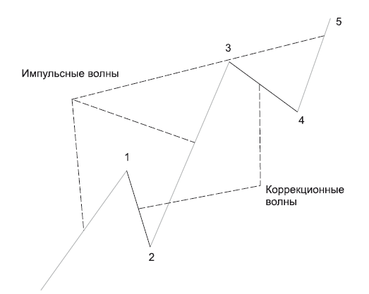 Существует два основных вида волн: импульсные и коррекционные (рис. 14). Их главное отличие – длина: импульсная волна всегда длиннее коррекционной. Это свойство, которое мы должны учитывать при прогнозировании движения цены и выставлении защитных ордеров. Но об этом позже. Сейчас давайте разберемся с волнами. В своем анализе мы будем использовать всего пять волн: