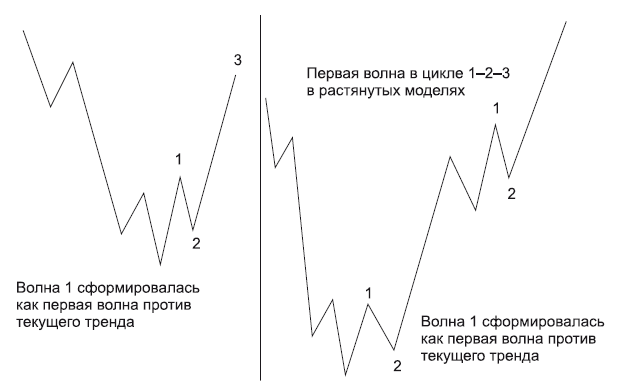 Волна 1 – импульсная волна, первая в цикле 1–2–3 может формироваться и как новая волна против текущего тренда, и как первая волна в цикле 1–2–3 в растянутых моделях.