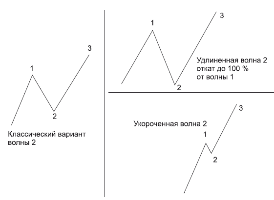 Волна 2 – коррекционная волна, образующаяся после формирования первой и идущая в противоположную сторону. По своей длине не может выходить за рамки первой волны. Откат, как правило, составляет 38,2–88,2 % по фибо-сетке.