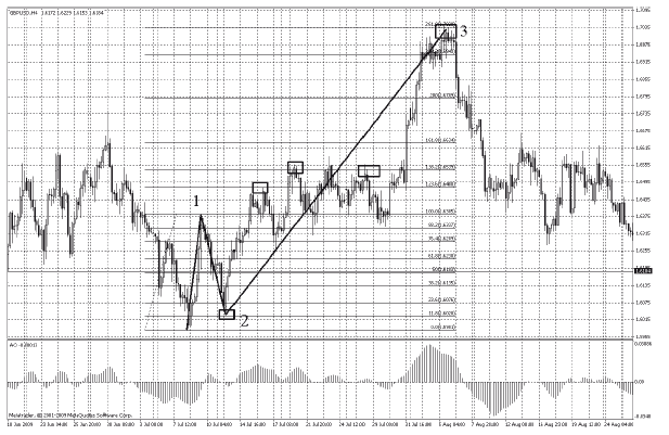 На рис. 28 вы видите два вида сеток: коррекционная помогла определить окончание коррекции (второй волны), а импульсная показала уровни сопротивления при развитии импульса (третьей волны). При коррекции отработал уровень 88,2 %, при импульсе сопротивление оказывали уровни 123,6 %, 138,2 %, и закончилась волна на уровне 261,8 %.