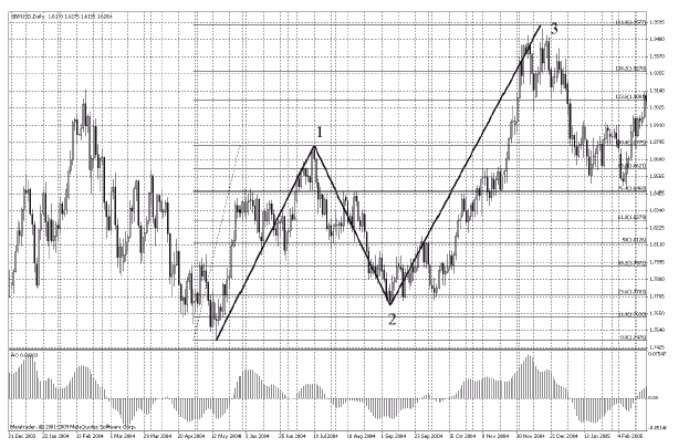 На рис. 35 изображена классическая третья волна. Обратите внимание: на графике она почти пункт в пункт отработала цель 161,8 %. Однако кроме этого уровня хорошо работают уровни 200 % и 261,8 %. Обращаю ваше внимание на то, что нормальная третья волна чаще всего формируется по движению тренда на старшем ТФ.