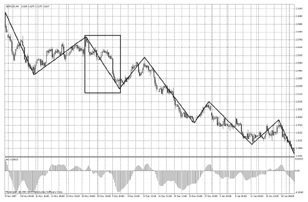 На рис. 36 вы видите медвежий тренд ТФ Н8. Волна, обозначенная прямоугольником, подробно рассмотрена на рис. 37.