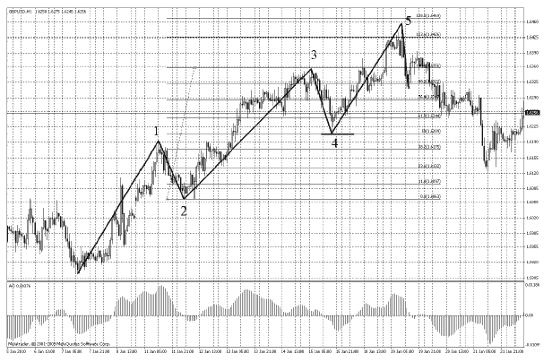 Пятая волна по длине, как правило, равна первой волне. Однако четко выполняющихся закономерностей, которые можно было бы использовать в торговле, я порекомендовать не могу.