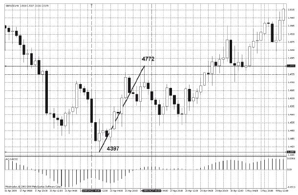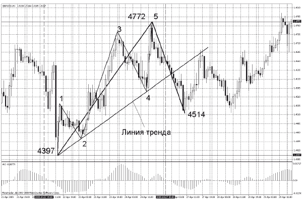 В стандартных настройках терминалов МТ4 установлены следующие ТФ: м1, м5, м15, м30, Н1, Н4, Д1, В1. Конечно, рынок Форекс не будет подстраиваться под МТ4, соответственно, могут формироваться волны абсолютно разных ТФ: ТФ м10, Н3, м2, Н6 и т. д. Но нам важно понять соотношение волн. То есть, если на рынке формируется волна, не нужно определять, м15 она или м13. Но необходимо понять, какая она относительно старшего ТФ Н1-Н4, и видеть ее волновую структуру на м1–м5. Чтобы было понятнее, посмотрим на график цен (рис. 47) и попробуем определить ТФ волны фунта 1,4397–1,4772.