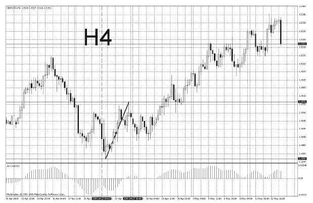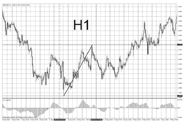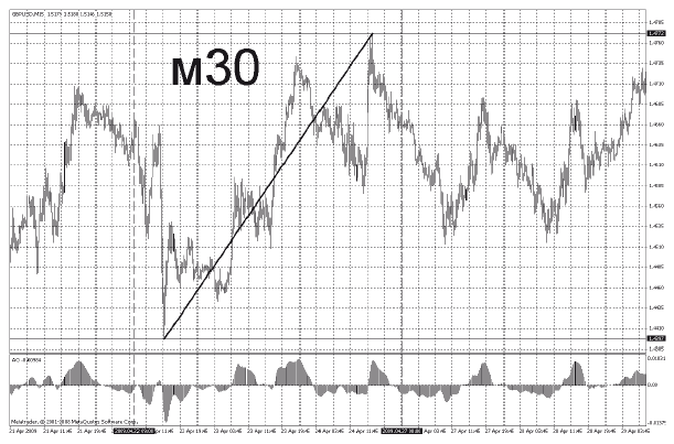 Чтобы понять, что я имею в виду, посмотрите на рис. 50 и 51. У нас от 4397 формируется бычья волна. На Н4 произошло пересечение АО нулевой линии снизу вверх. Это говорит о том, что волна идет ТФ не меньше Н4, далее переходим на Д1 и смотрим, что на Д1 пересечения индикатором снизу вверх нулевой линии не было. Это говорит о том, что волна от 4397 ТФ меньше Д1. Вырисовываются две границы волны от Н4 до Д1 (то же самое мы опередили визуально). Чтобы более точно определить ТФ этой волны, нужно установить дополнительные ТФ в терминале МТ4. Но для торговли такие точные расчеты не нужны, достаточно понимать соотношение волн и подволн. В этом нам поможет трендовая линия.