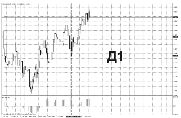 Нашим помощником будет индикатор АО[21]. Здесь действует четкое правило. Если АО пересекает нулевую линию, ТФ волны, в которой произошло пересечение, будет не меньше ТФ, на котором построен индикатор АО. Причем при бычьей волне пересечение должно произойти снизу вверх, а при медвежьей – сверху вниз.