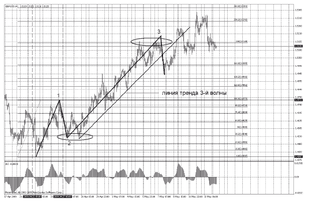 Откат волны 2 от 1 составил 62 %, затем пошла третья волна, которая отработала 200 % от первой. Во время хода третьей волны по пикам ее подволн мы опять строим линию тренда. И когда очередная подволна пробивает эту линию, можем сказать, что третья волна закончена.