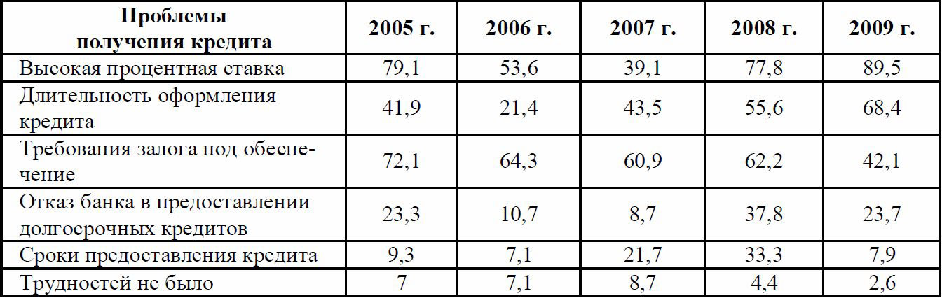 Условия получения банковского кредита для большинства сельхозор-ганизаций являются неприемлемыми, прежде всего, ввиду высокой ставки процента и отсутствия необходимой залоговой базы (табл. 2).