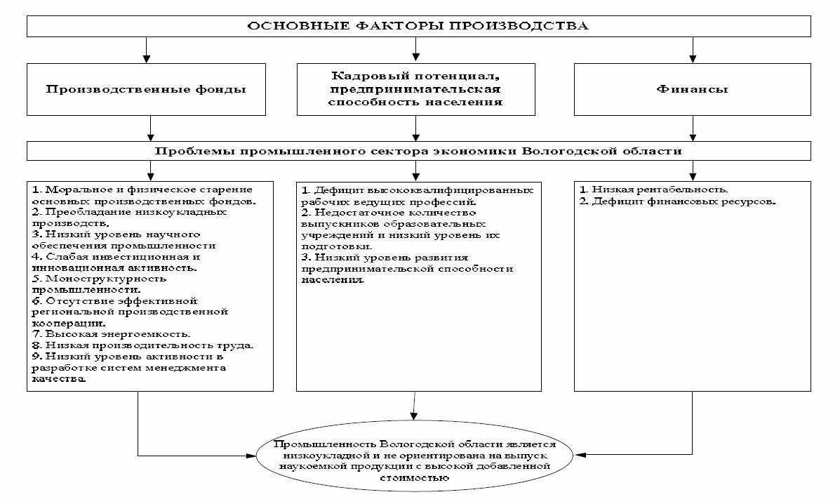 Таким образом, все проблемы развития промышленного сектора экономики Вологодской области можно объединить в несколько блоков: 1) проблемы производственного характера; 2) кадровые проблемы; 3) проблемы финансового характера. Под воздействием указанных факторов промышленность Вологодской области является низкоукладной и не ориентирована на выпуск наукоемкой продукции с высокой добавленной стоимостью.