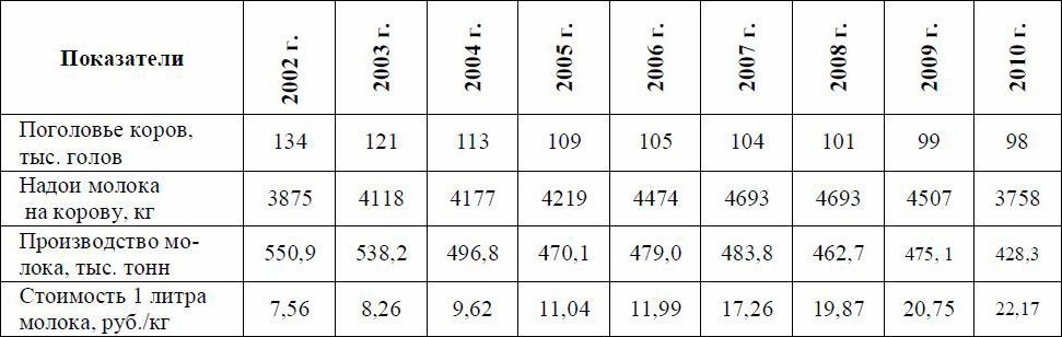 ? происходит ежегодное снижение надоев молока в связи с сокращением поголовья крупного рогатого скота. Так, в Вологодской области за последние десять лет поголовье сократилось на 36 тыс. коров;